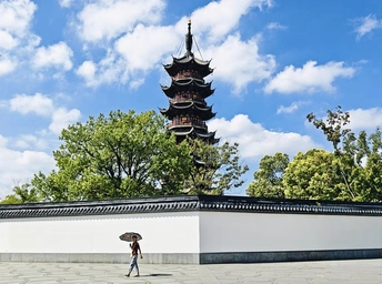 龙华寺的塔,龙华寺外的白墙,和偶然走过的人