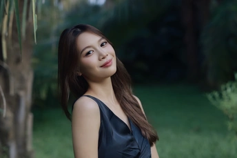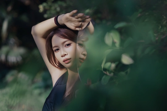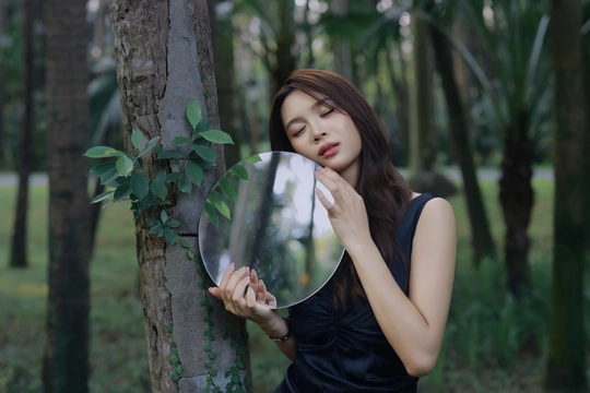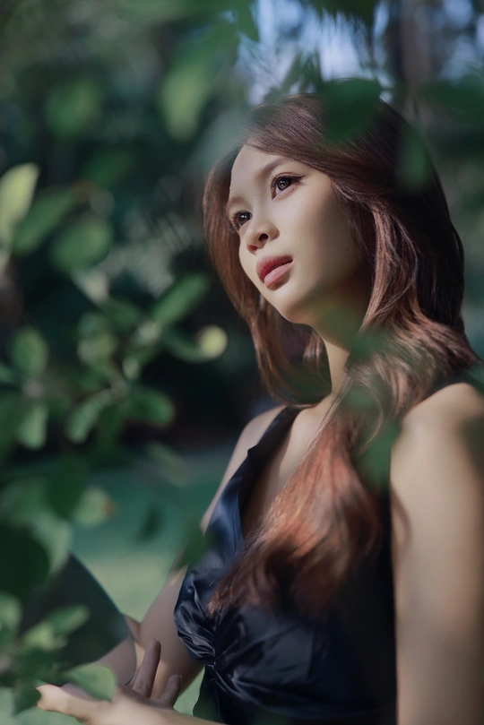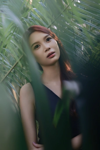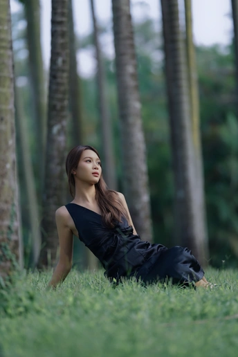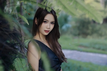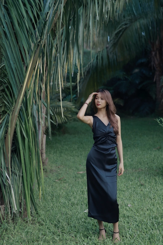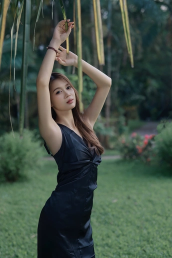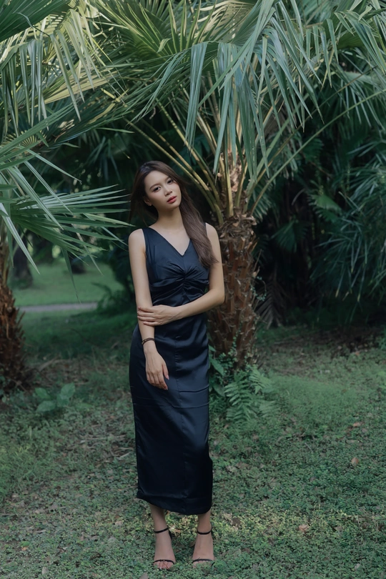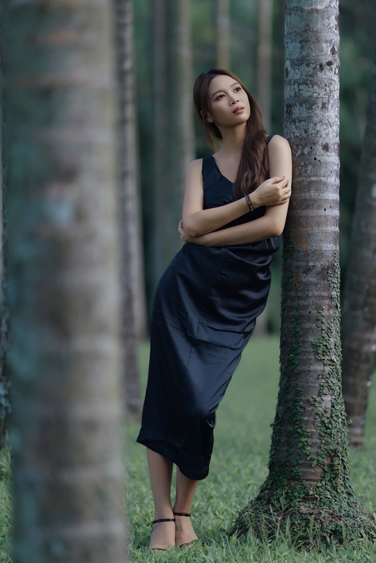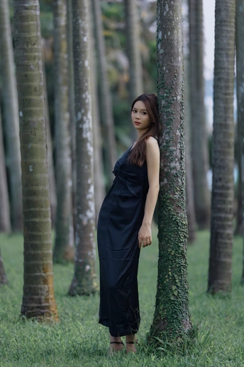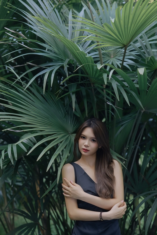 她立于棕榈林间,黑裙随微风轻摆,每一缕光影都是情绪的注脚,在绿意的怀抱里,将初秋的思绪揉进了树影与裙裾的缠绵中。