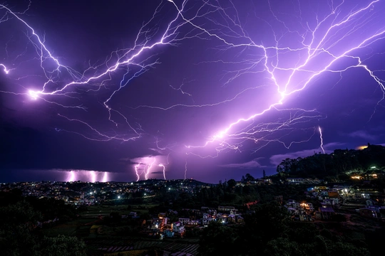 这张拍摄于马达加斯加雨季末期的照片展现了典型的树状闪电。主闪电通道从云层向外延展,沿途分出清晰的分支,仿佛自然的脉络在夜空中书写能量的语言。这类闪电常在热带强对流天气中出现,是电荷在大气中寻找放电路径的结果。短暂一瞬,照亮整片山城。