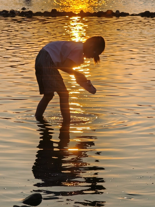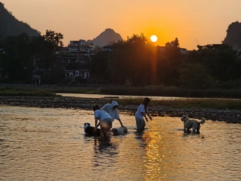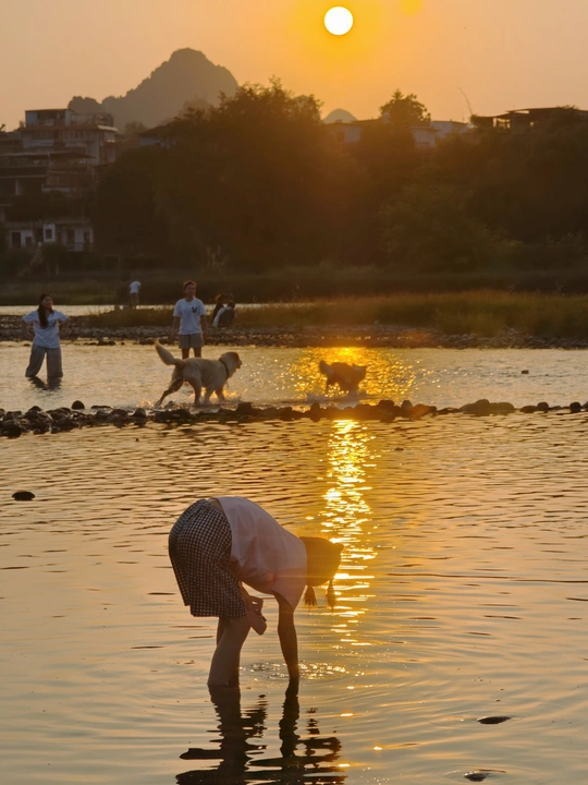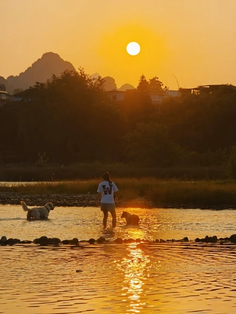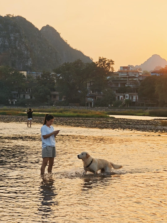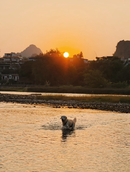 光线运用:采用日落时分的黄金光线,暖色调光线为画面镀上柔和光晕,营造出温馨浪漫氛围,同时利用逆光、侧逆光,让人物、狗狗与景物形成鲜明轮廓,增强画面层次感与立体感,水面反光也丰富了光影效果,使画面更具视觉吸引力。 场景与主体结合:以山水、村落为背景,将人物与狗狗互动置于自然场景中,人与自然和谐相融。河流作为核心元素,不仅是人物活动的载体,其波光粼粼的质感也为画面增添灵动性,不同景别(近景、中景、远景)的切换,全方位展现场景与主体关系,让观者感受场景的开阔与生活气息。 瞬间捕捉:精准捕捉人物与狗狗互动的动态瞬间,如狗狗戏水、人物与狗狗互动的姿态等,这些鲜活瞬间传递出轻松愉悦的情绪,使画面富有故事性与感染力,能引发观者情感共鸣,展现出摄影师对生活场景中美好瞬间的敏锐洞察力。 构图技巧:运用三分法、对称式等构图方式,让画面元素分布均衡协调。例如将太阳、山峰等置于画面关键位置,引导观者视线,同时人物与狗狗在画面中的布局,既突出主体,又与背景自然衔接,使画面整体既具秩序感又不失生动性。