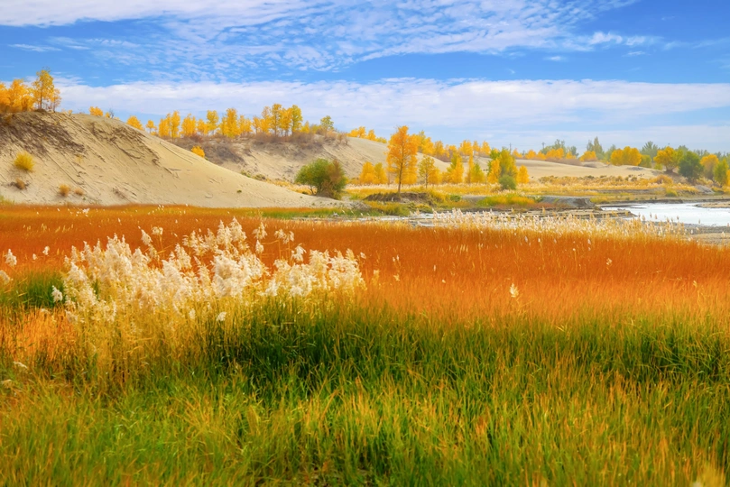 河流冲击沙漠形成了一片滩涂,滩涂上的芦苇、水草与沙漠、胡杨构成一幅美丽的画面。