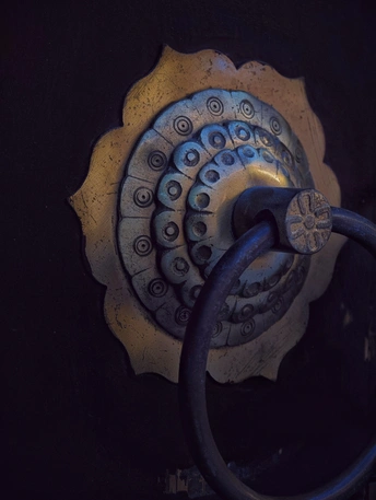 这枚古铜门环,莲纹流转间尽是岁月的刻痕,似是时光的锁扣,将一段段旧梦锁在门扉之后,每一次衔环轻叩,都像是在叩问历史的回响。