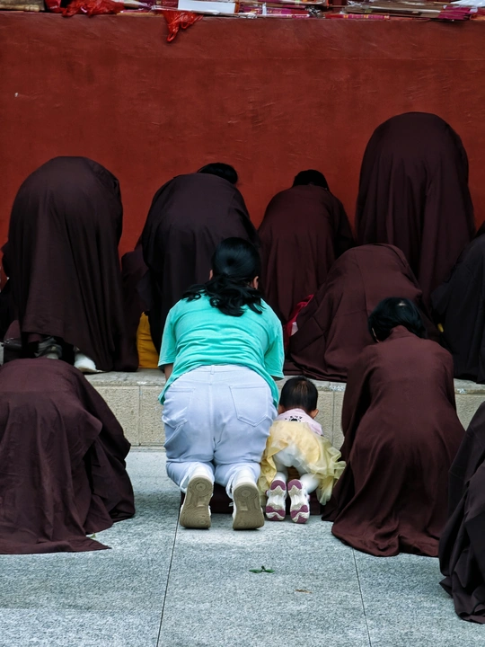 绛红的墙是沉默的山, 褐袍们伏成虔诚的浪, 而她和小小的她, 是浪尖上 一抹翠、一瓣黄。 孩子的鞋尖翘着, 像要把祈祷 系成蝴蝶的模样, 落在这庄重的褶皱里, 让信仰的重量, 也掺进 童真的轻。