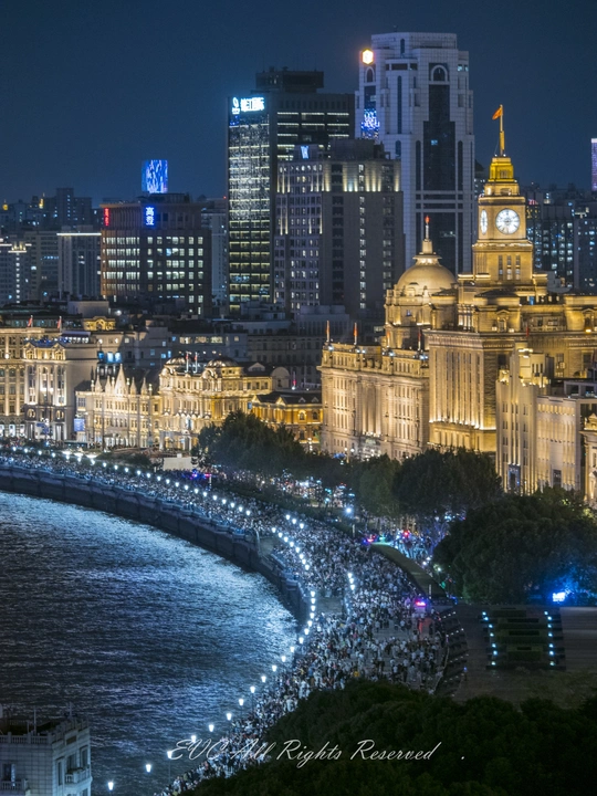 国庆期间,上海外滩游人如织,黄浦江反射的蓝色灯光与夜色中金碧辉煌的外滩建筑群交相辉映。