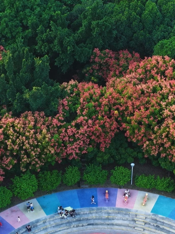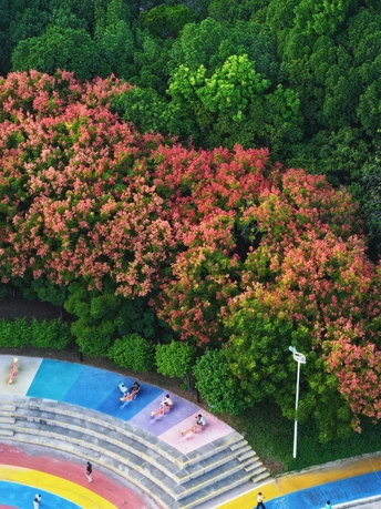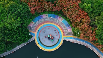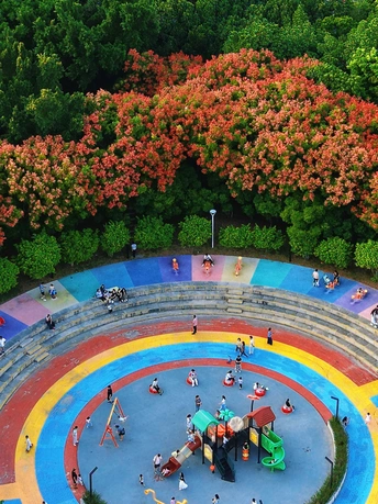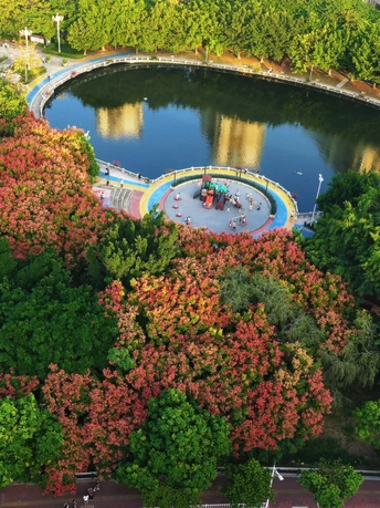 初秋星湖公园,彩虹童趣乐园遇绯红栾树,澄澈湖水映葱郁绚烂,成城市梦幻一角。大人享悠然,孩子得欢喜,每处色彩、每缕花香,皆诉自然生活温柔诗行。