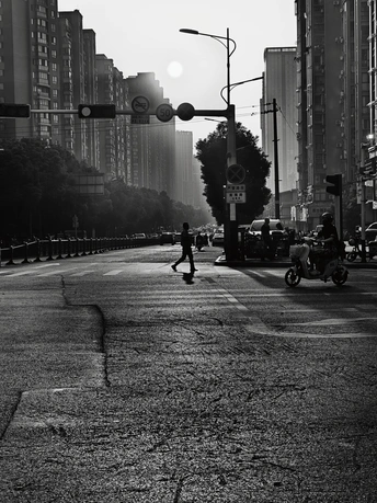 太阳把楼宇切成竖线的琴键, 风是指尖, 在柏油路上 弹着空旷的和弦。 他穿过斑马线, 影子被拉得细长, 像条未写完的诗行, 而电动车的嗡鸣, 是给这城市晨曲 添上的 第一笔轻响。