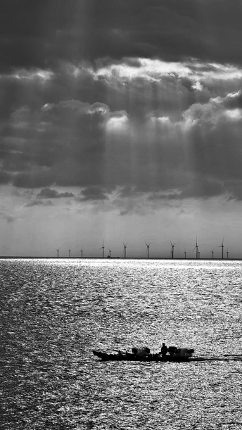 日出丁达尔光映海面,远处海上风车清晰可见。