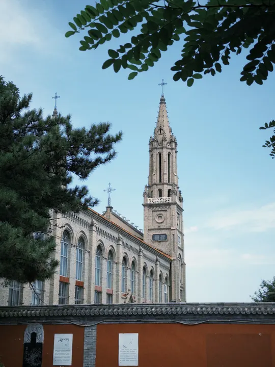 建筑上,教堂的尖顶、拱窗等细节尽显哥特式建筑的空灵与精致,砖石质感在光线中清晰可辨;色彩上,蓝天的澄澈、绿植的鲜润、红墙的厚重与建筑的暖灰形成丰富层次,既展现了历史建筑的庄严感,又通过自然元素的点缀增添了灵动气息,传递出一种古今交融、庄雅兼具的视觉韵味。