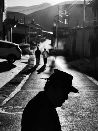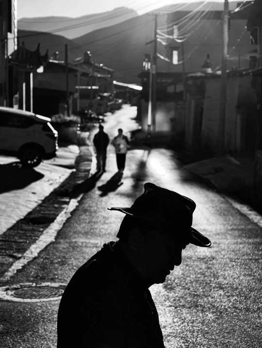 一个戴礼帽的男子闪现在香格里拉的逆光街头,帽身的纹理与质感在光影交织下朦胧而神秘,帽檐微微下倾,诉说着不羁与洒脱。