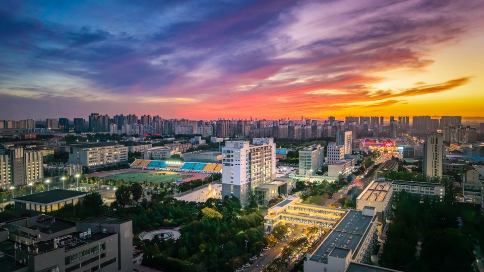 在日落的蓝调时刻,天边的火烧云被太阳映红了,我拍下学校教学楼与火烧云的这样一幕。