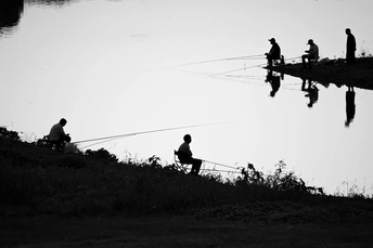 黑白影调里,钓者与竿线勾勒水岸轮廓,涟漪轻漾、草影静伏,时光在垂钓的静默中慢成水纹褶皱。