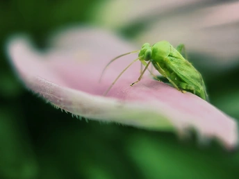 粉瓣如笺,凝着一身春绿的小客正以长须作笔,轻触这抹柔粉的肌理。