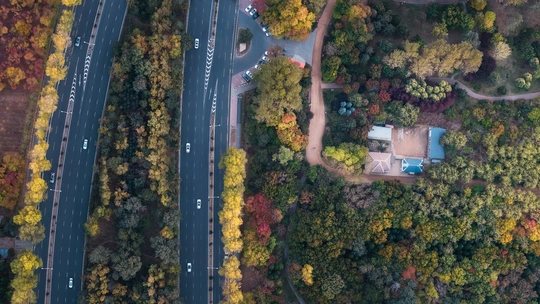 当航拍镜头俯瞰长春百木园的秋日,层林尽染的色彩如打翻的调色盘,在大地上晕染开诗意。公路似墨蓝丝带穿梭于斑斓林间,车辆成为画中的灵动点缀,藏在林海中的屋舍与小径,更添了几分烟火与野趣的交融。百木园的秋,是树的狂欢,是光的嬉戏,每一帧航拍画面都在诉说着北国深秋的绚烂与温柔。