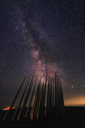 今年6月进民勤沙漠那天,本是冲着“摘星小镇”的名字去碰运气,没成想傍晚蹲在沙丘上等银河时,撞见了这丛尖刺状的雕塑——它们在暮色里像半截埋进沙里的星芒,风裹着细沙擦过金属杆,响得像宇宙里的低鸣。 等到后半夜银河垂下来,紫雾似的漫过雕塑顶,忽然想起当地向导说这是沙漠雕塑营里的作品,叫“星骨”——是艺术家借这些向上刺的杆,说“沙漠里的风与星,都是大地的骨头”。我架着相机曝了四十分钟光,直到脚边的沙凉得浸人,才看见镜头里银河裹着雕塑,像把宇宙的骨架钉在了这片曾被说“荒芜”的沙地上。