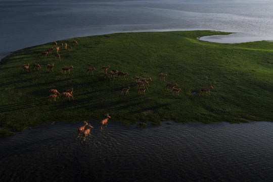 江苏省盐城市大丰区黄海野鹿荡,生态保护区湖中央的绿岛浸在日落余晖里,草甸从近到远铺展成浓绿的绒毯,中华麋鹿群落散落在岛上:部分低头啃食嫩草,影子被斜光拉得修长;另有几只正踏过浅滩往水中行,蹄尖拍起的波纹裹着暖金的光。远处湖面泛着冷调的蓝,与岛上的暖光形成明暗对比,湿地的潮润气息仿佛随着镜头漫开,将这方天地的灵动感妥帖收进画面。 拍摄设备:大疆mavic4pro,参数:ISO 200 f2.8 1/1250s