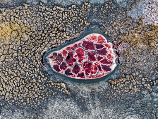 无人机从高空俯拍,将乌兰湖的奇景尽收眼底。这片位于沙漠中的湖泊,如心脏般的形态与血色裂纹极具冲击力,周围是干裂的土丘与枯黄植被,荒芜与湖的瑰丽形成强烈对比,仿佛地球在沙海中跳动的脉搏,尽显自然的奇幻与苍凉。