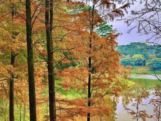 水边的落羽杉裹了层秋阳,橙红浸在波里,连风都染成暖色调。