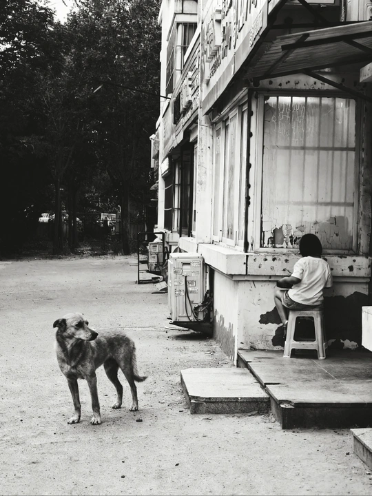旧时光在墙皮上剥落出岁月的褶皱风穿过树影,在路面烙下细碎的温柔那只狗,把目光抛向远处的烟火,似在丈量平凡里的悠长与清瘦,她守着一方小凳,与光阴对坐指尖在时光的经纬里默默穿梭犬的张望,人的沉默在这黑白的街角酿成一阕关于生计与陪伴的歌,没有惊天动地的壮阔,只有尘埃里,生命与生命的偶然交错。在平凡的世界里,写就不声不响的永恒段落
