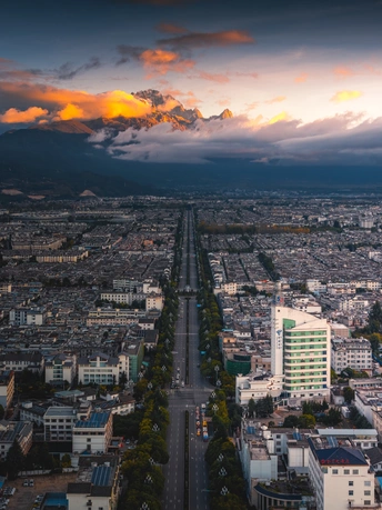 秋日清晨,朝霞轻拢玉龙雪山覆金纱,丽江随晨光缓缓苏醒,街巷之中,笔直道路似丝带穿梭。