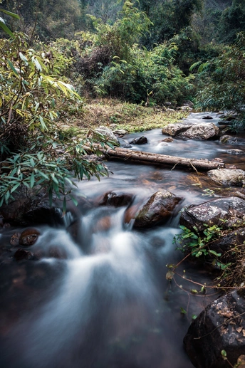 溪水在石间缠缠绕绕,把时光都磨成了丝滑的白。两岸的绿植把影子投进水里,枯木横在溪上像段沉默的故事。山林的风穿过叶隙,溪水的声响温柔得像在耳语——这方小天地,把自然的“野”与“柔”揉成了一首能让人心静下来的诗。