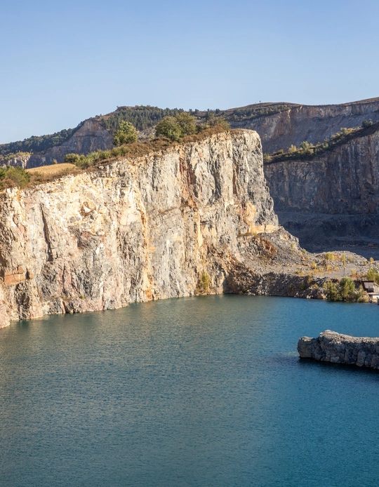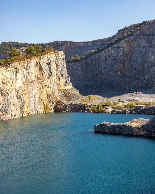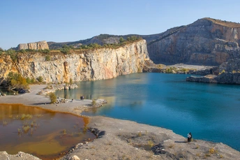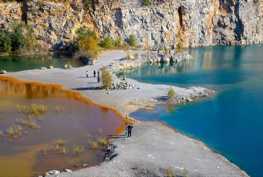 辽阳青峰村小天池,原来是一个废弃的采石场矿坑,在原有积水和工业用水的基础上,加上雨水的蓄积,在周围采石后留下的怪石之下,形成了一处独特的“三色湖”景观。