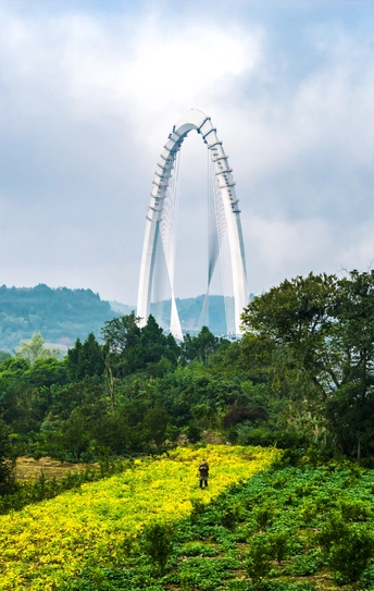 四川简阳金简仁快速路新建的沱江大桥,秋色植被之中像一个时空之门。
