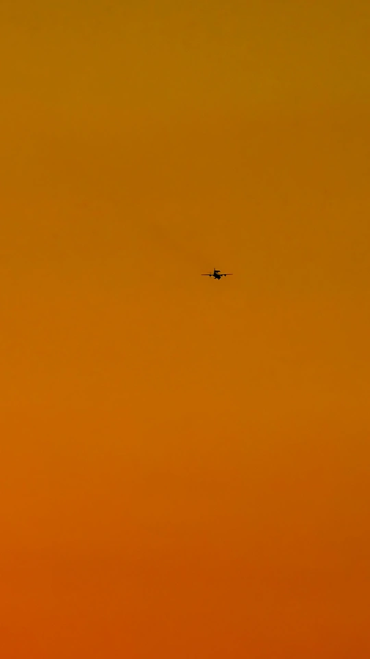 秋天日落后短暂的橘色系天空,一架飞机飞过,逐渐没入其中。