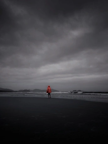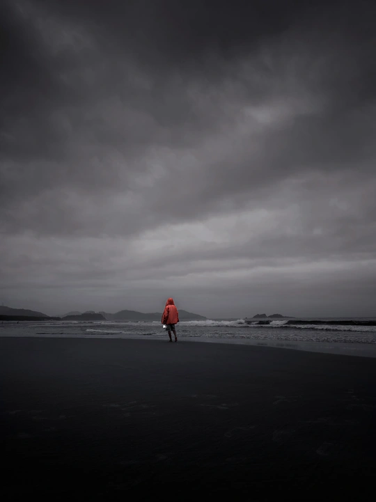 在灰蒙的天幕下,大海收敛了往日的喧嚣,只将层层浪涛轻拍向黝黑的沙滩。一个身影裹着鲜亮的红,独自在天地间行走,那抹红像一簇倔强的火焰,在沉郁的色调里燃烧出孤勇的姿态。或许此刻的他,正于这份寂寥中与自己对话,任海风裹挟着思绪,在潮起潮落间,寻找内心的答案。