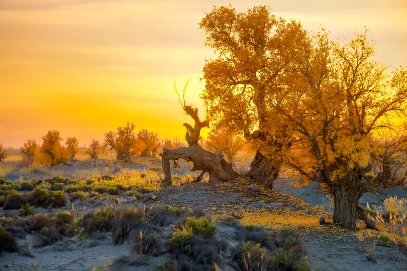 秋染胡杨,在黄昏的旷野书写千年的守望