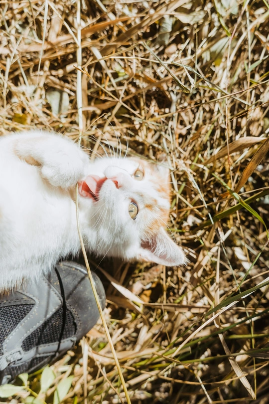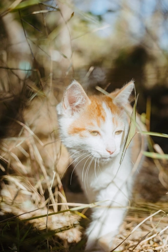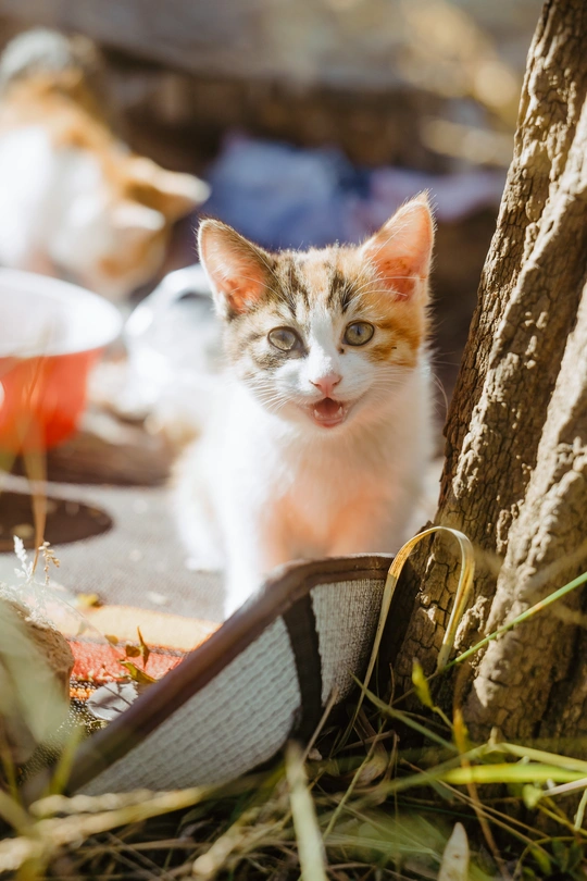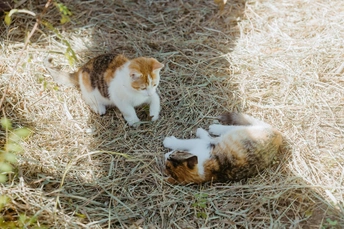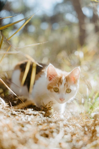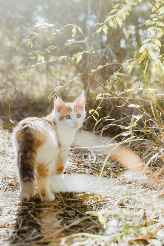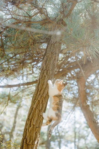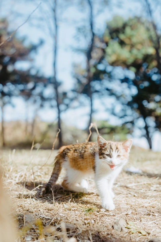 爬山的途中,在树林间发现三只小猫,它们在树林它们的小房子里愉快的玩耍。房子应该是好心人给建的,还在放在外放着几盘吃的喝的,小猫们在房子周围奔跑者,在树林间爬来爬去,它们在它们的桃花源里幸福的生活着。