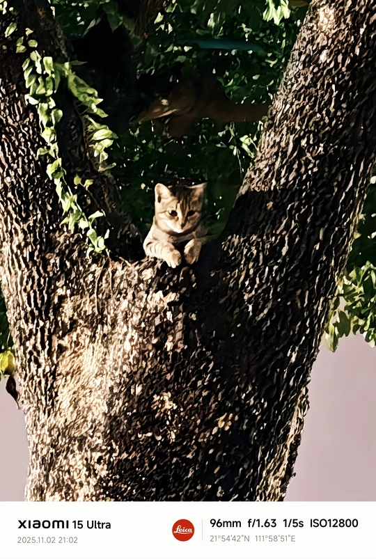 小狸猫调皮跑上树玩,不敢下来。