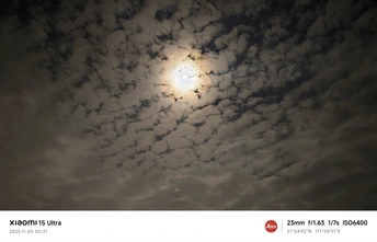 这张照片捕捉了一个静谧而神秘的午夜瞬间。圆月宛如一枚温润的珍珠,被层叠舒展的云朵温柔环抱。月光穿透云隙,洒下柔和而富有层次的光芒,为深沉的夜空染上一片静谧。蓬松的云朵呈放射状向四周蔓延,仿佛夜的呼吸,整个画面沉浸在深灰与米白交织的宁静色调中,令人心绪平和。