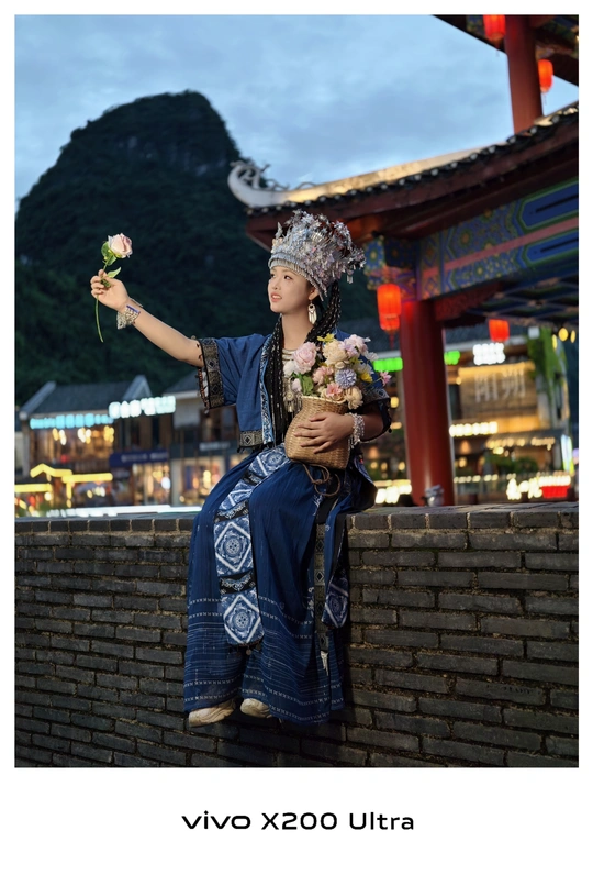 在阳朔西街这里,当夜幕降临,一群群的游客穿着苗族装来这里拍照打卡,夜晚独有的魅力,在夜色里拍摄人像,有别样的美。