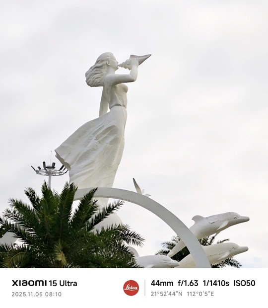 渔女雕像名为“唤醒”,是位于阳江市区东风四路和金山路 交会处大令环岛的地标性雕塑,以吹螺号渔女形象为核 心,象征唤醒渔民出海和新一天的开始,是城市海洋文化 的重要象征。本次拍的是近景
