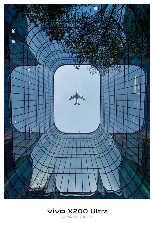 拍摄于广州的无限极广场大楼,大楼像一口井一样围着一圈,四角的独特造型和阴影让整个画面立体感极强,而上空飞过的飞机,在这一刻,彷如苍穹之间的浩瀚星空一般,让人充满遐想。