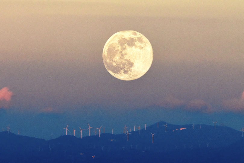 在海风吹拂的傍晚,远山与风车在月色下安静伫立。一轮明月高悬天际,照亮心中的思绪,也抚平了尘世的喧嚣。此刻,时间仿佛静止,只有风声与月光在山谷间低语。