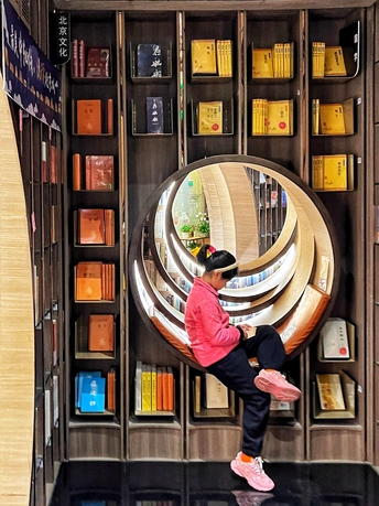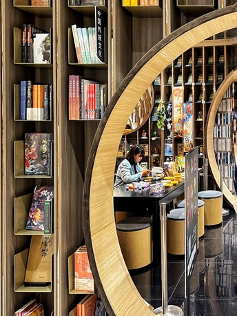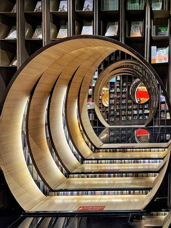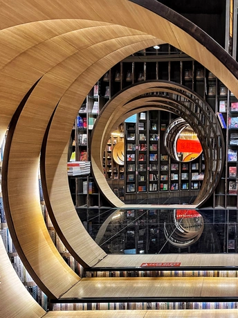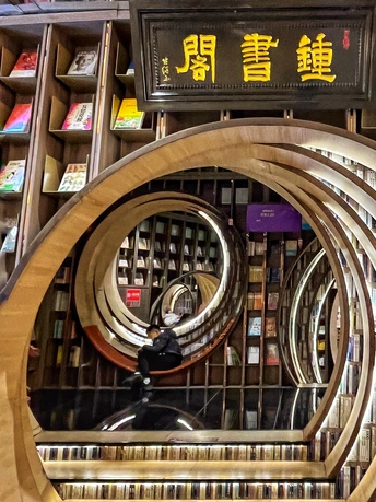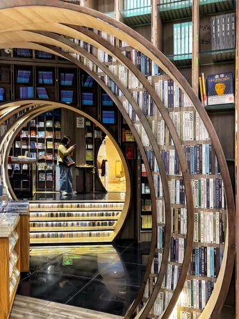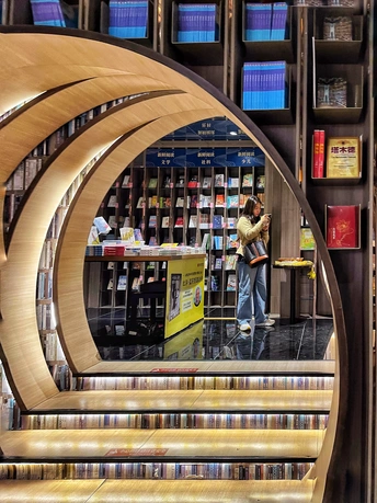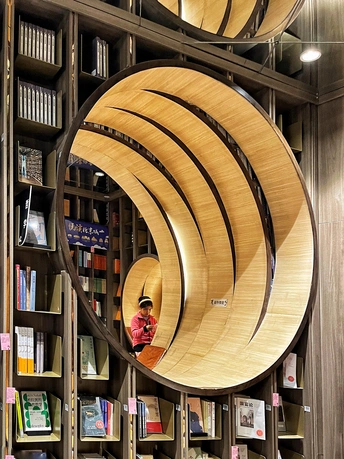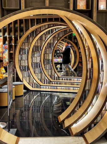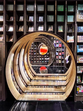 钟书阁(西单老佛爷店)是北京的第二家店,占地面积1100平米,拥有近50000册图书。与中关村店的设计理念有所不同,借鉴了古典园林的移步异景手法,营造了五个独特的区域:水月洞天、书之丛林、屏之风也、古建童趣,以及中间的咖啡飘香。 设计融合了北京传统建筑特色“北京四合院月洞门”,借鉴了古典园林移步异景的表现手法,以行云流水般的空间布局串联起了各功能区。钟书阁的设计会根据所在城市的风格变化,即使是同一座城市的门店,设计也会有所区别。这个书店的设计采用了圈圈叠加的镂空设计,营造出一种空间错位的感觉。每次走进这里,都像是穿越到了一个异世界。特别是当你穿过那层奇幻世界,进入开阔的空间时,顶层玻璃的反射让整个书店看起来更大更明亮。木质细柱和镜框设计让人仿佛置身于一个镜子世界,经常让人误以为前面就是一面透明玻璃,小心翼翼地前进。