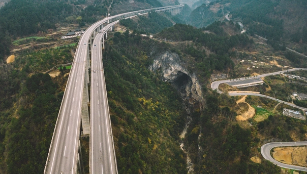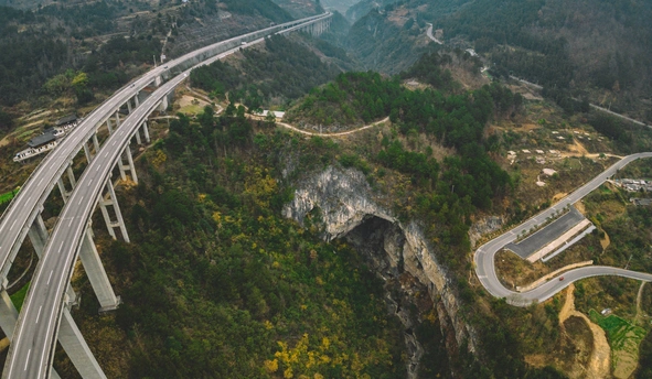 2025年1月3日,航拍贵州省黔东南苗族侗族自治州丹寨县南皋乡石桥村穿洞古法造纸景区。溶洞左边高空是余安高速横空跨越,右边是X802县道紧贴大穿洞蜿蜒而下。 此景是贵州省这些年交通事业快速发展的一个缩影。