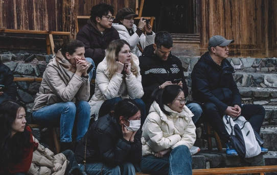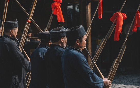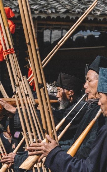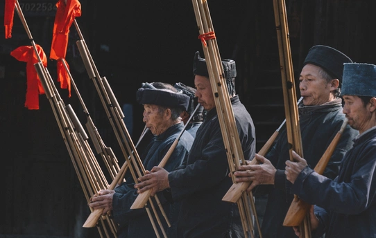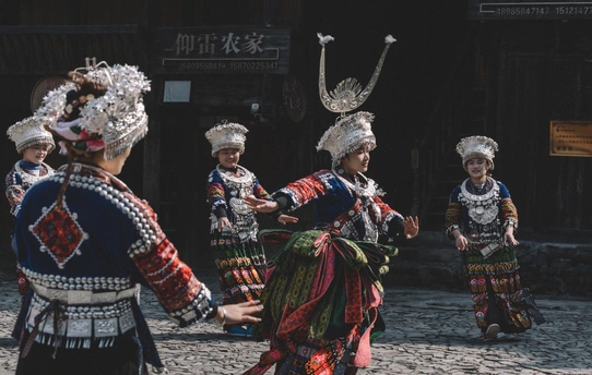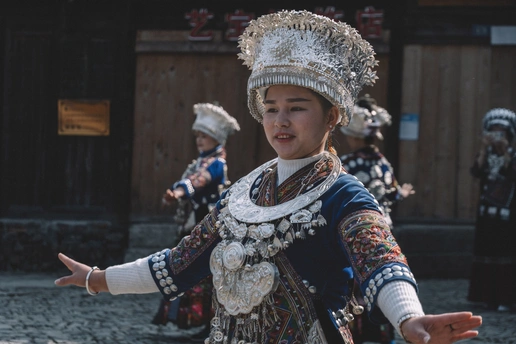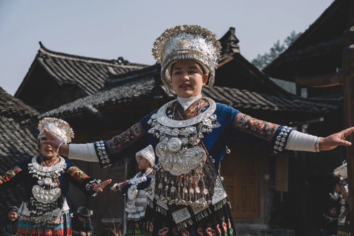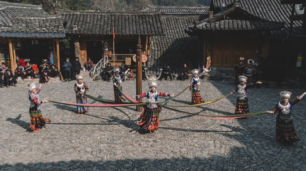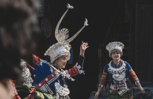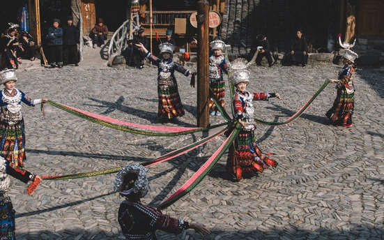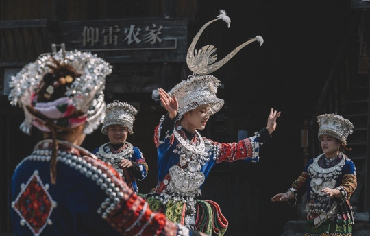 2025年1月3日,贵州省黔东南苗族侗族自治州朗德苗寨,这是黔东南地区保存完好的苗族传统村寨之一 ,村民们载歌载舞喜迎八方宾客。 朗德苗寨是国家级4A风景区,以百年历史的吊脚楼群、风雨桥等苗族特色建筑闻名,其古建筑群被列为全国重点文物保护单位。