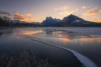 冰封的落基山,某些湖边有一些温泉区域不结冰。反而有些美丽的前景配合日出的光线。