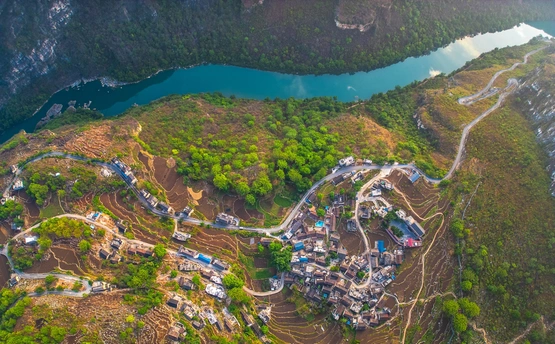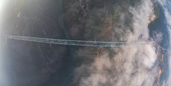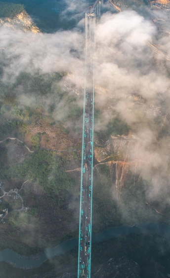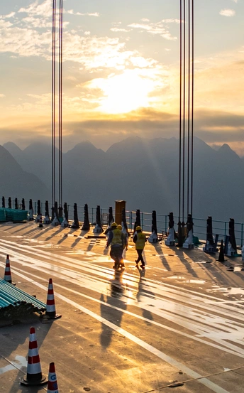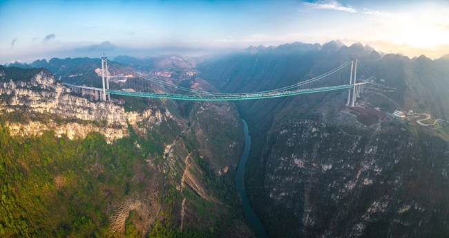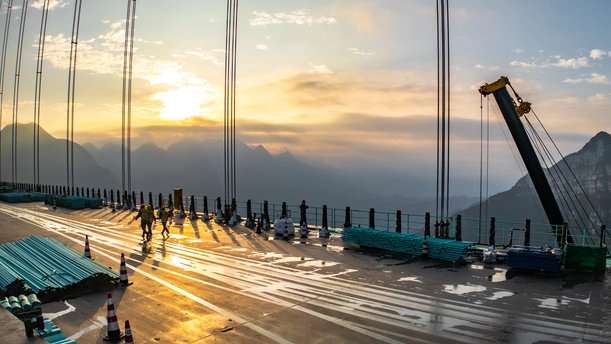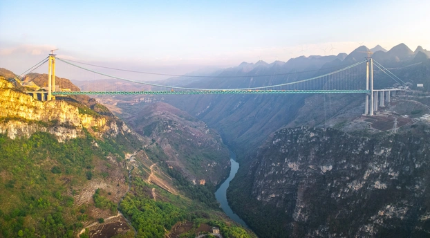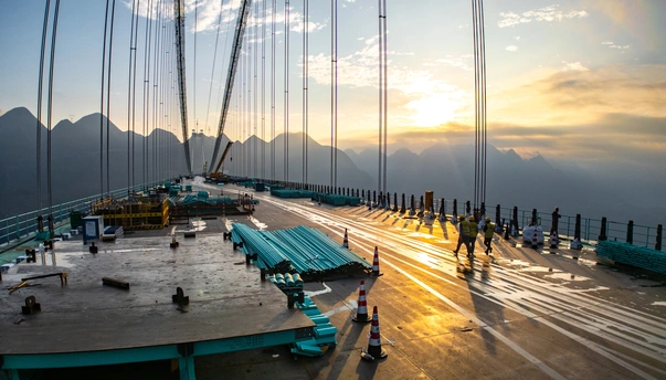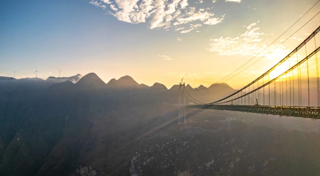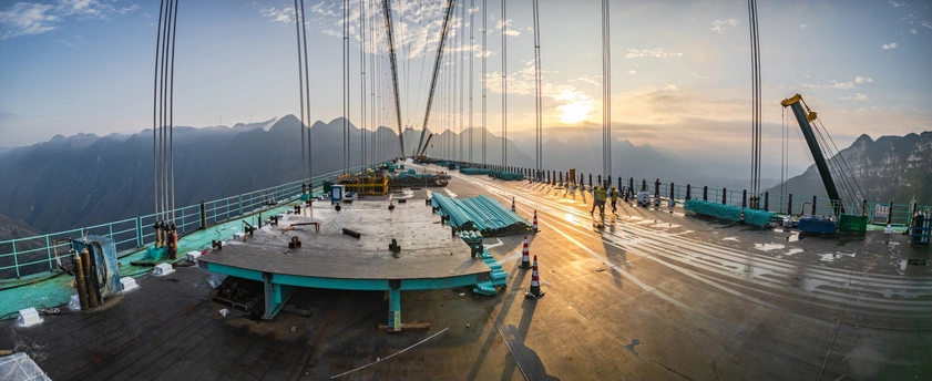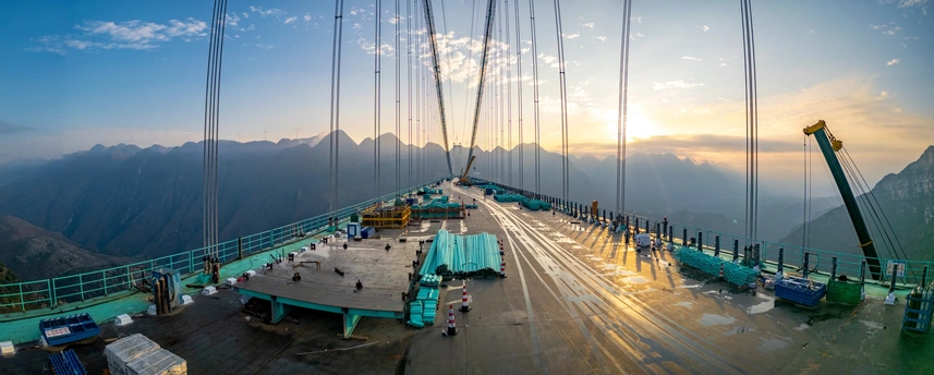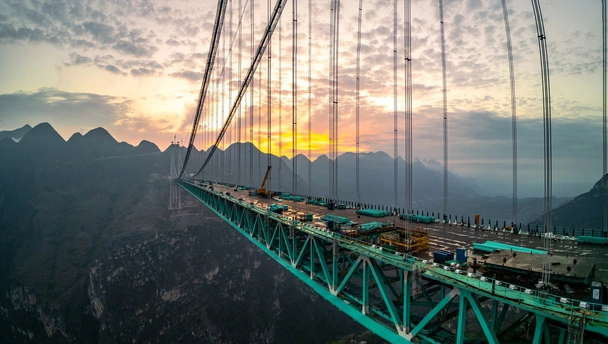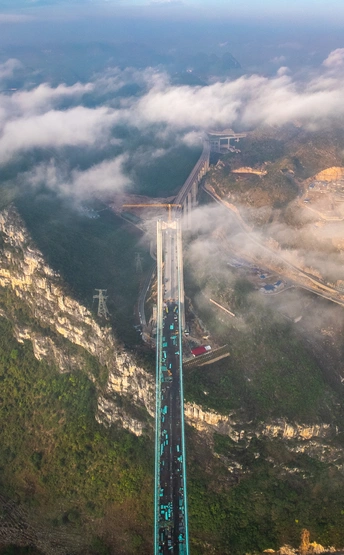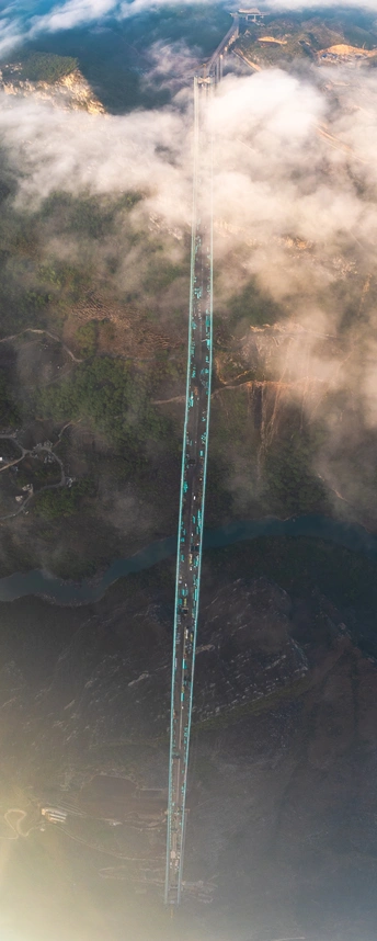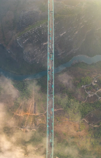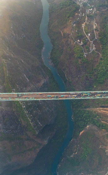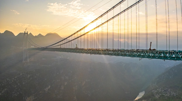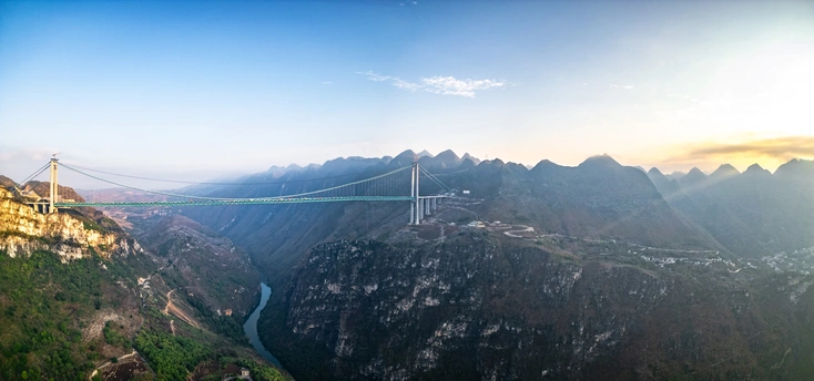 2025年5月4日,贵州省黔西南布依族苗族自治州贞丰县花江村上空,正在建设中的花江峡谷大桥清晨的光影时刻。建设者迎着朝阳开始一天的忙碌,世界第一高桥下的花江村和北盘江渐渐苏醒,阳光和云雾中的高桥十分唯美而壮观。