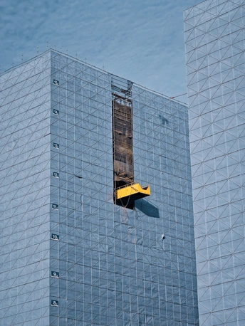 在城市的天际线间,两座现代感十足的建筑并肩而立。蓝色幕墙如澄澈天空的延伸,几何线条勾勒出秩序之美。而那意外的缺口,恰似生活里的不期而遇,黄色平台似在诉说未完成的故事。于规整中窥见打破,于既定里遇见未知,城市的建筑也藏着生活的隐喻,等待着有心人去解读