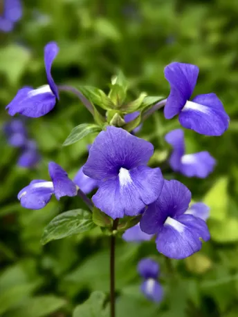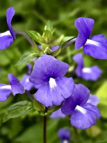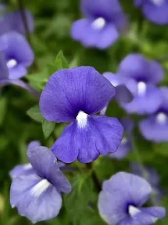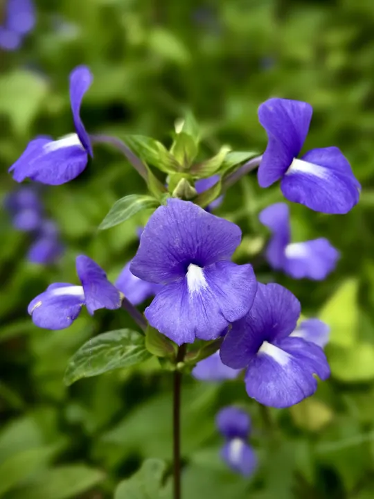 蓝金花(也叫蓝鲸花),像一簇簇蓝紫色的小蝴蝶结落在绿叶间,自带清冷又温柔的气质~花瓣唇形张开,花心那抹白像藏了颗小珍珠,灵动又精致。