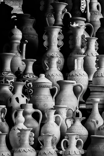 在喀什古城的土陶巴扎里撞见这一墙器皿时, 整个人都慢了下来。 这些土陶是维吾尔族模制法的非遗手艺, 指尖刻出的涡旋、叶纹, 裹着丝路的风——据说陶土是高崖上的“色格孜”土, 揉三天、烧五小时, 每道纹路都是六代传承人的指温。 黑白色调里, 它们像沉默的史书, 把汉代的器型、当代的花纹叠成了一墙烟火气。 举起相机时, 光刚好漏过陶罐的镂空, 落在最下层那只刻着花的壶上, 突然懂了“手艺是时光的容器”这句话。