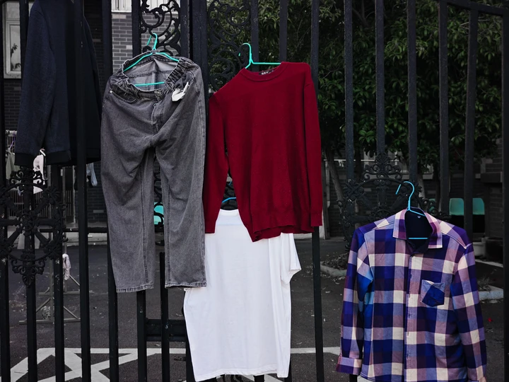 阳光正好的日子,把衣物挂在铁艺围栏上晾晒。深蓝外套、灰色牛仔裤、红色毛衣、纯白T恤还有格纹衬衫,每一件都带着生活的气息。微风拂过,它们轻轻晃动,似在诉说着日常里的点滴温暖与惬意