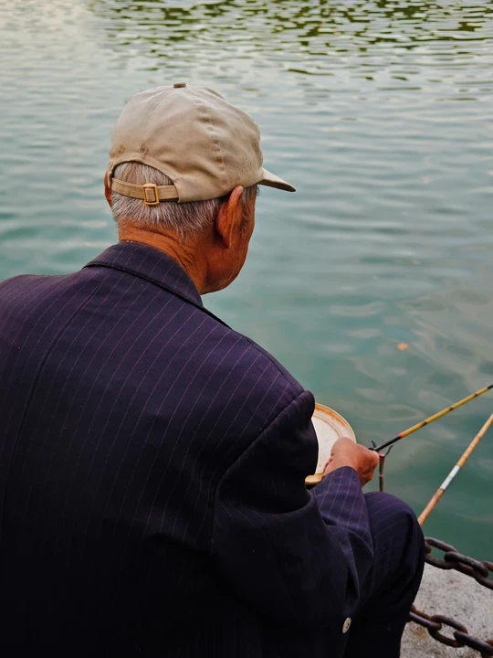 在宁静湖畔,一位老者悠然垂钓。他头戴旧帽,身着素衣,背对着世界,独守一方安宁。时光仿佛在此刻放慢脚步,唯有水波轻漾,钓竿微颤。这是岁月沉淀后的淡然,亦是与自然相拥的惬意,在喧嚣之外,寻得内心的静谧港湾