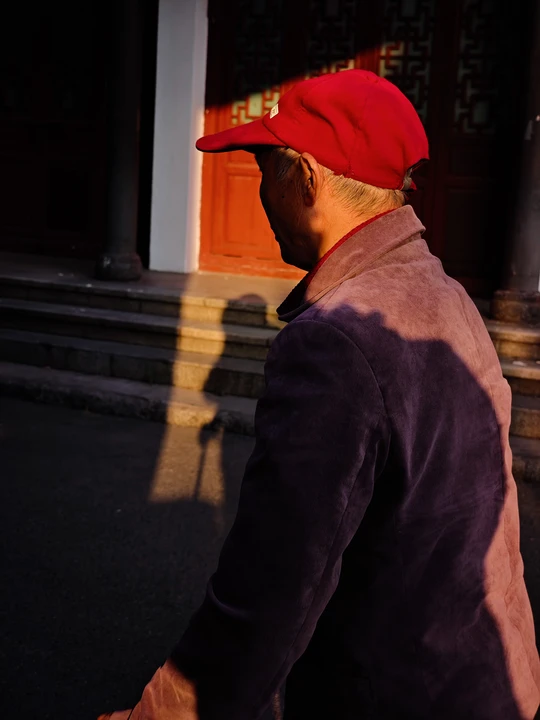 在岁月的光影里,老人独自踱步。那顶鲜艳的红帽,似是时光里跳动的一抹炽热。他的背影,被夕阳拉长,仿佛在诉说着往昔的故事。古老的建筑静静伫立,与他一同见证着日子的流转,那是独属于此刻的宁静与深沉,让人不禁在心底泛起对岁月的遐思