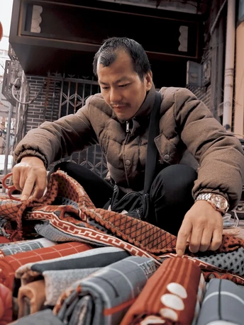 在城市的一隅,他专注于手中的织物,仿佛时间都为他停下。这些带着独特花纹与色彩的物件,承载着岁月的故事。他用双手触摸生活的纹理,每一个褶皱、每一道线条,都是生活真实的模样。在平凡的日常里,他与这些织物对话,编织着属于自己的小世界,也编织着对生活质朴的热爱