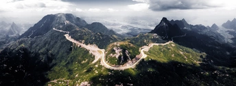 这条盘山公路像条银带缠在青山的腰上,翠色漫过峰峦,连风里都裹着草木的潮气。远处水网织在平野间,雾霭把天与地揉成淡蓝的软纱——站在这山巅,才懂什么是“云在脚下,景在眼底”。
