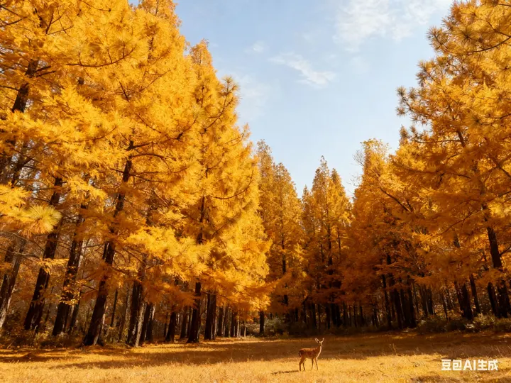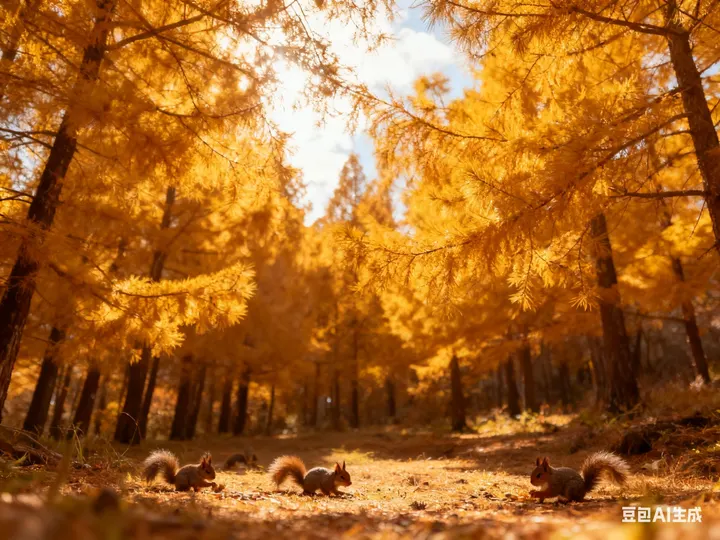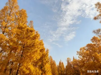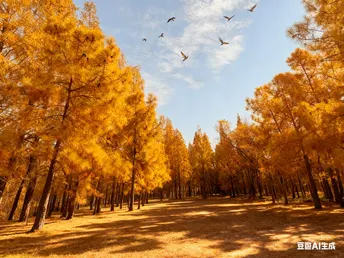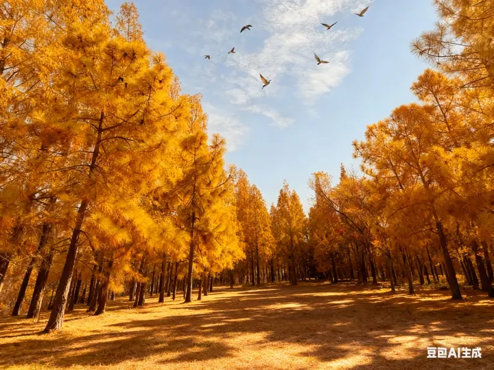 金黄的针叶林如打翻的金箔,在澄澈的蓝天下铺展开层层暖意。阳光透过枝叶,筛下碎金般的光斑,落在地面上,与枝叶的影子交织成温柔的诗行。几只飞鸟掠过天际,翅膀划过云影,给这片静谧的金色画卷添了几分灵动的生机。风掠过树梢,沙沙声仿佛是秋林在轻声诉说着季节的温柔絮语。